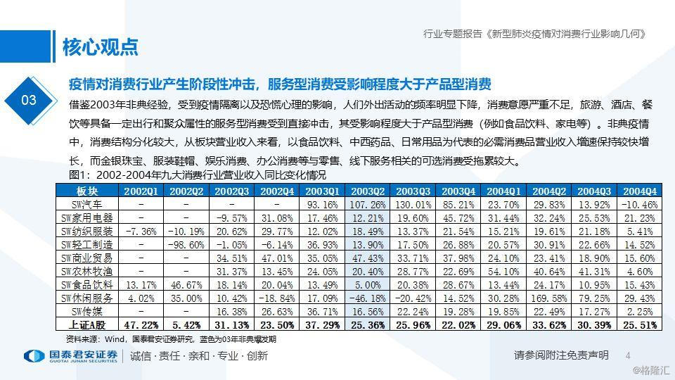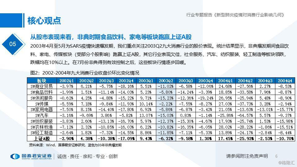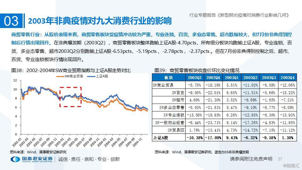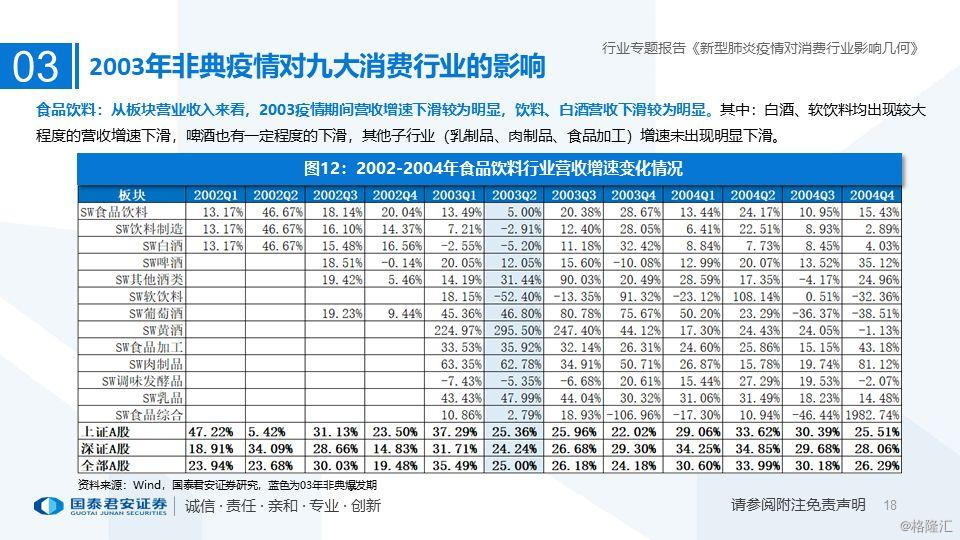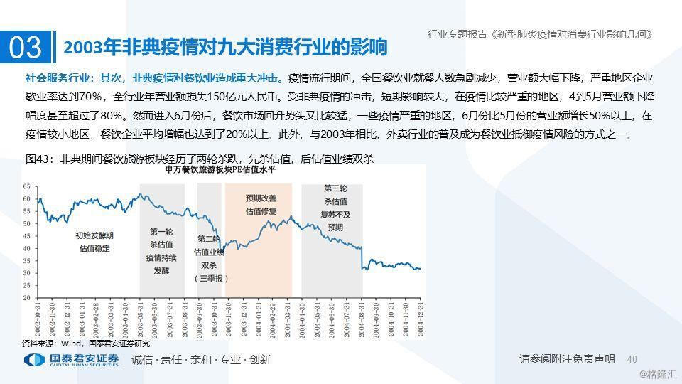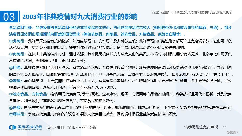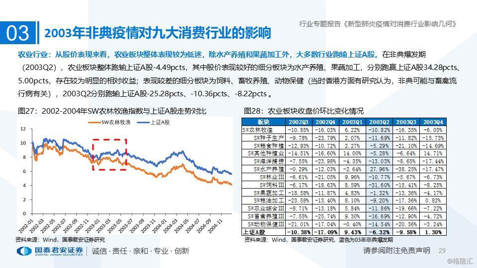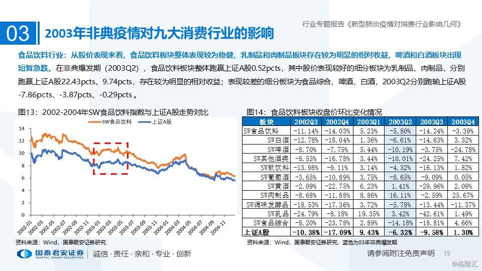 ④短期调整迎来布局机会:受本次疫情影响,消费行业有调整压力,短期布局必选消费品企业,中长期重点布局超跌龙头企业。重点关注疫情边际改善和疫情消除两个时间点,一旦疫情出现边际改善,股价将企稳。参考2003年非典,随着疫情慢慢消除,基本面将逐渐企稳回升,可选及服务性消费反弹力度将更大。