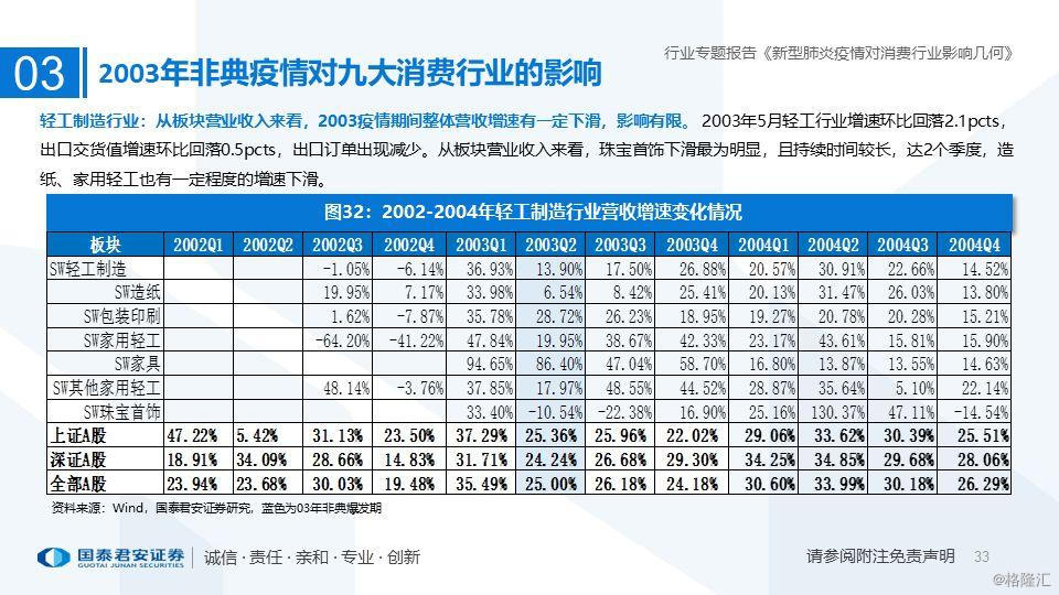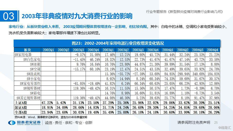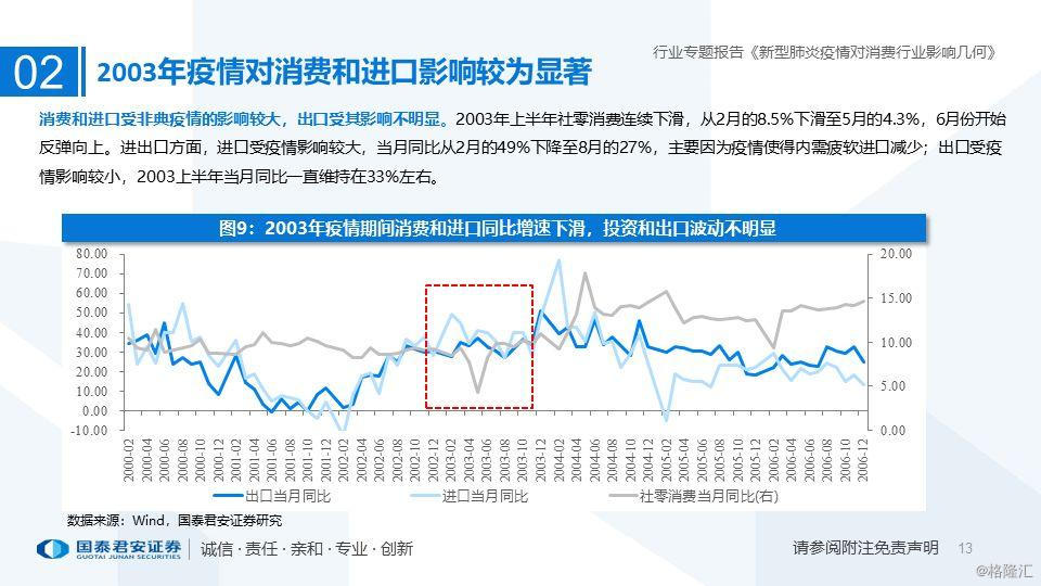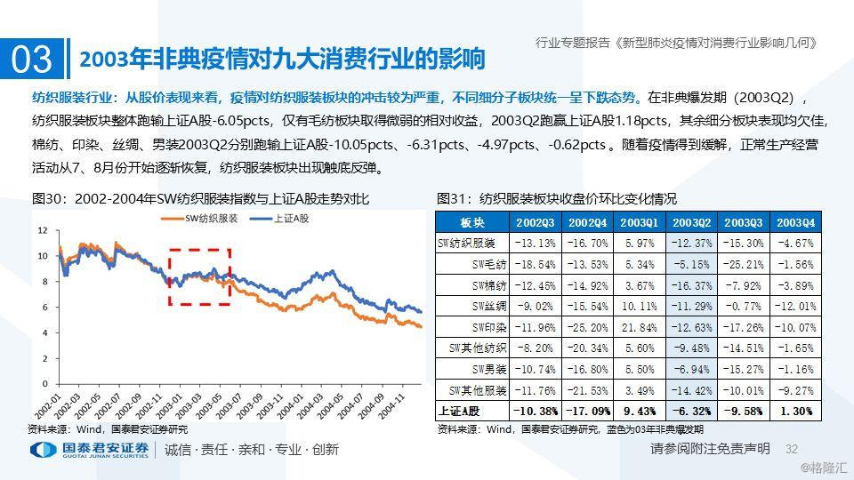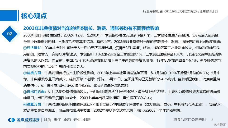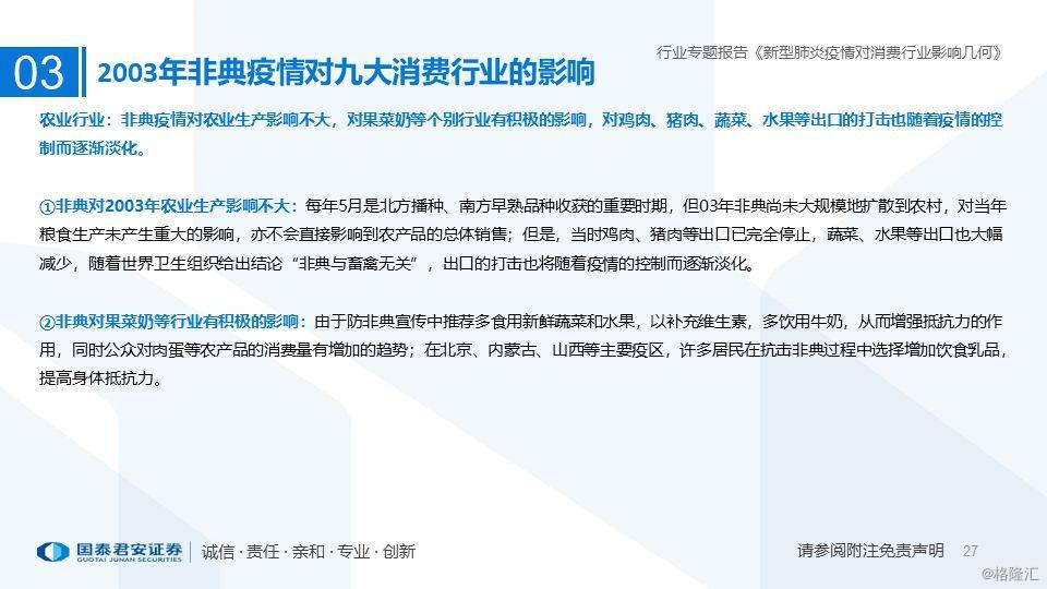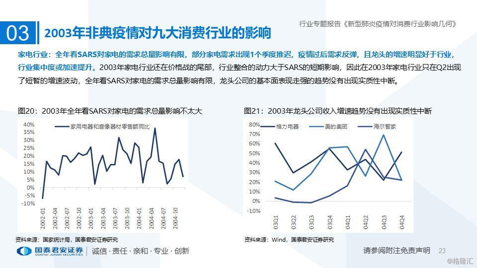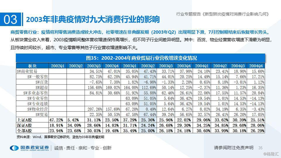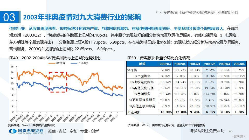 ④短期调整迎来布局机会:受本次疫情影响,消费行业有调整压力,短期布局必选消费品企业,中长期重点布局超跌龙头企业。重点关注疫情边际改善和疫情消除两个时间点,一旦疫情出现边际改善,股价将企稳。参考2003年非典,随着疫情慢慢消除,基本面将逐渐企稳回升,可选及服务性消费反弹力度将更大。