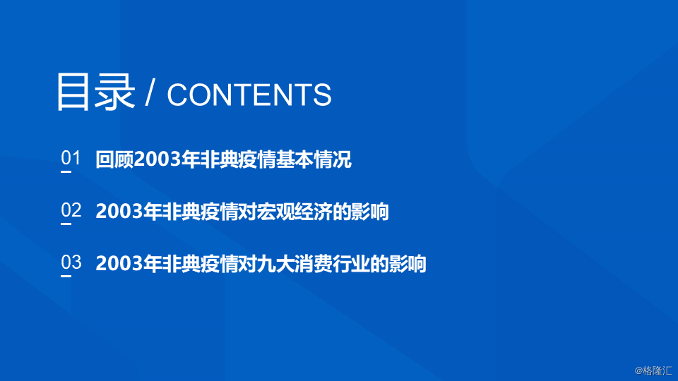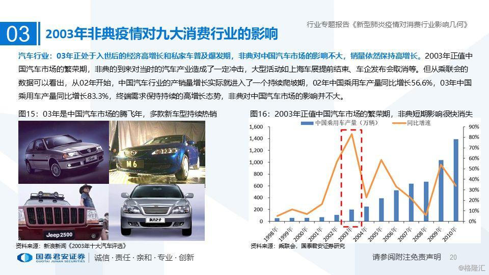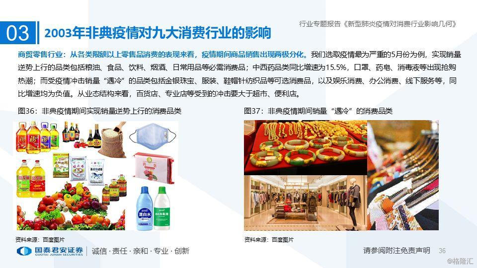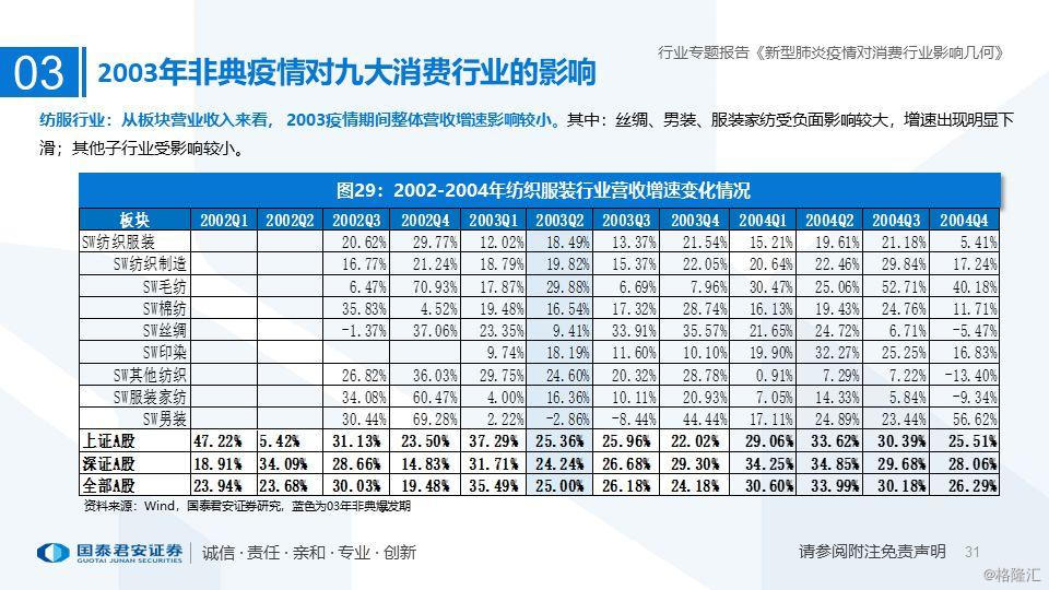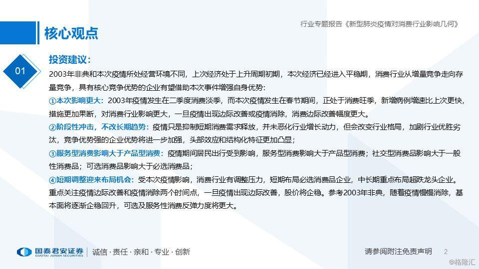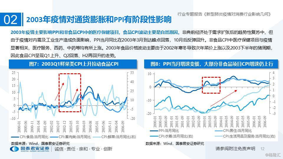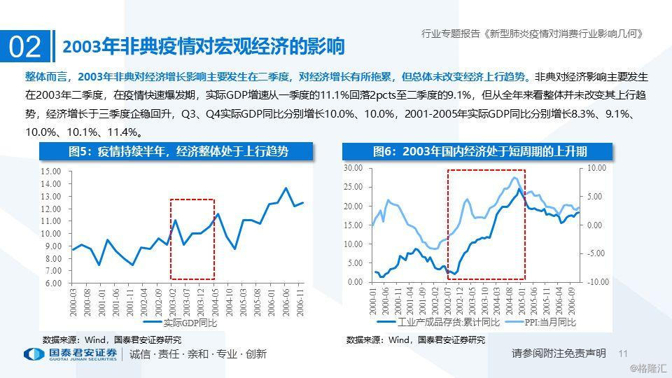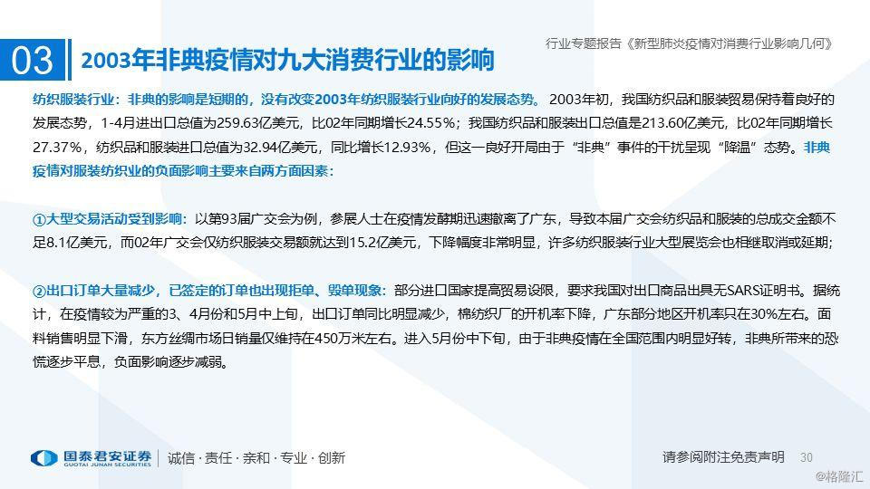 ④短期调整迎来布局机会:受本次疫情影响,消费行业有调整压力,短期布局必选消费品企业,中长期重点布局超跌龙头企业。重点关注疫情边际改善和疫情消除两个时间点,一旦疫情出现边际改善,股价将企稳。参考2003年非典,随着疫情慢慢消除,基本面将逐渐企稳回升,可选及服务性消费反弹力度将更大。