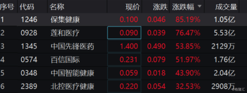 中国医疗集团股价从新年首个交易日的0.113港元涨至目前的3.33港元,区间涨幅高达28倍。此外,保集健康暴涨101%,莲和医疗涨84%,中国先锋医药涨57%,中国智能健康涨54%。