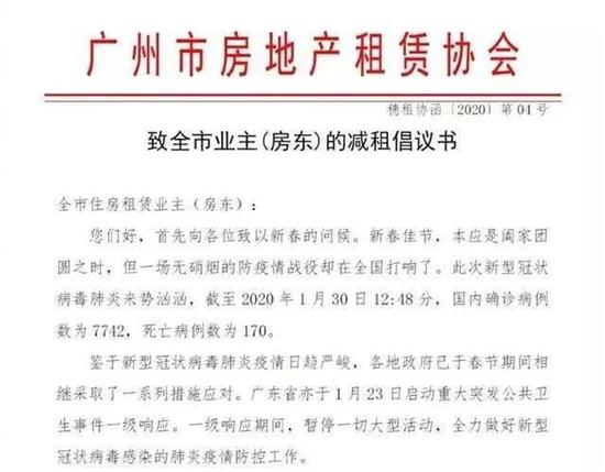 1月30日,广州市房地产租赁协会发布《致全市业主(房东)的减租倡议书》,呼吁大家“共度时艰”,号召业主给商户减免2月的租金,3月和4月的租金减半收取。