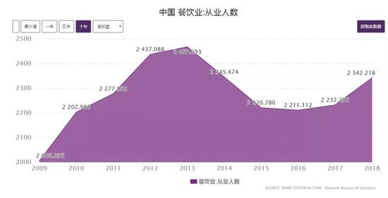 除了产出的贡献,还有吸纳就业的贡献。餐饮是一个高度劳动密集型的行业,2018年全国从业人数高达234万,而同年第三产业从业人数为21067.7万人——1.1%是餐饮人。