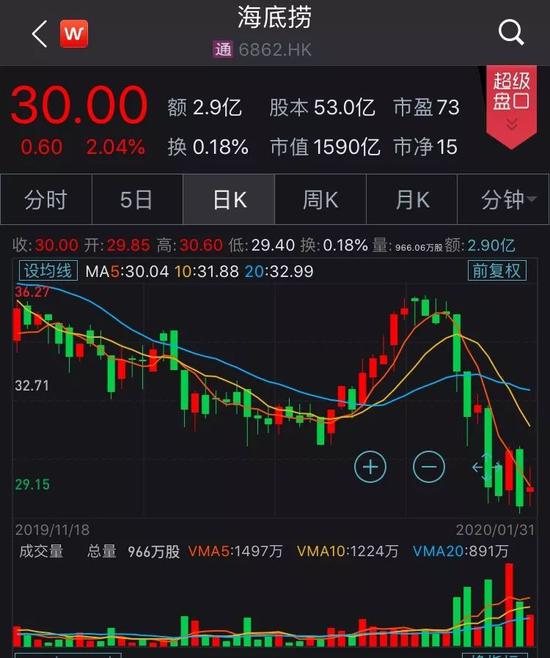 受此影响,港股餐饮类公司的股价受到不小冲击,其中,海底捞股价在节后开市后震荡加剧,而在节前,海底捞股价从1月中旬的阶段高点的跌幅超过15%;相比之下,刚刚上市的九毛九则有些“悲壮”,1月中下旬以来,公司股价便一路走低,这一趋势在节后仍未止住。