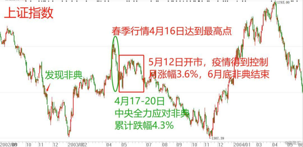 回顾2003年非典共经历了疫情扩散、全民抗疫、疫情退散三个阶段。其中疫情集中爆发期对股指短期冲击大。关键时点发生在4月17-20日,中央开始全力以赴应对,采取了包括人事任免在内的各种必要紧急措施。4月20日北京市公布的非典确诊病例从前一天的37例增至339例。国家高层的空前重视,加之非典确诊的数量突增,引发群体对疫情的恐慌,全民抗疫期4月17日后A股春季行情走势急转直下,4月17日至25日股指大跌7.2%。4月28日,股指见到非典期间最低点后迎来指数反弹。