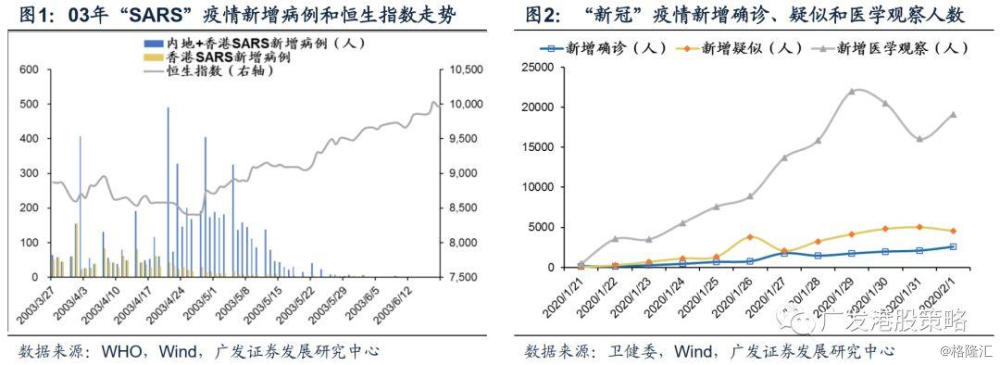 1.关于市场走势,春节假期“新冠”疫情发酵前后的港股基本沿循03年“SARS”期间“相似的剧情”,当前仍处于恐慌情绪的快速宣泄阶段;预计行情的“转折点”分别出现在对疫情的认识从“恐慌→缓和→消退”之际,参考03年“SARS”经验,新增病例尤其是新增疑似病例的放缓可作为参考。