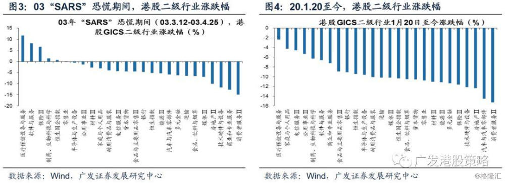 2003年“SARS”恐慌期间(03.3.12-03.4.25),港股二级行业中跌幅最为显著的是食品饮料、媒体、房地产、技术硬件、商业服务、消费者服务(如博彩),医药、软件与服务、保险上涨;而今年1月20日“新冠”疫情发酵至今,港股媒体、房地产、技术硬件、汽车与汽车零部件、消费者服务跌幅居前,医药、软件服务、高股息(电信服务、公用事业)跌幅最小。值得注意的是,受出行受限影响,港股汽车股出现“恐慌式下跌”;而受经济预期下行影响,港股保险股也遭受冲击,这与03年“SARS”的经验有所差异。