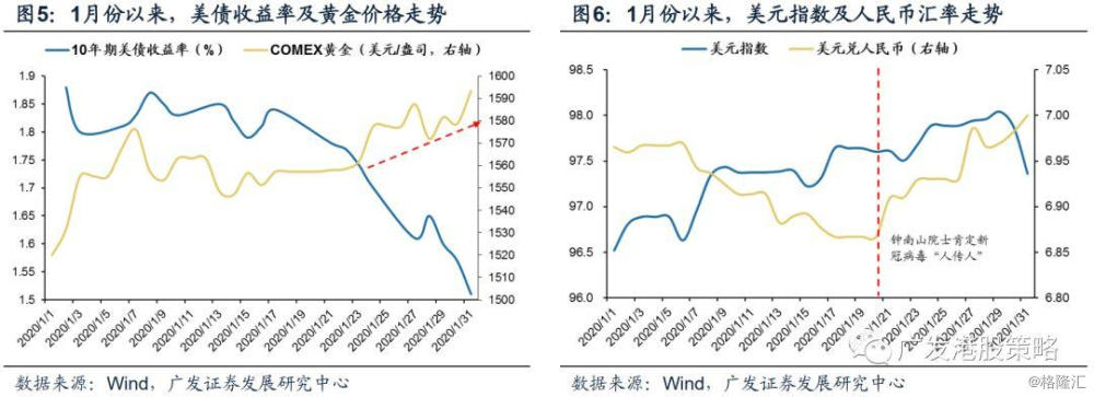 1月20日以来,美债价格走高(收益率迅速下行)、黄金价格上涨,全球避险情绪走高,市场担忧因“新冠”疫情造成中国及全球经济“引擎”失速,从而再次回到“衰退疑云”的模式;加上1月21日“新冠”疫情发酵后,人民币兑美元汇率出现快速贬值(离岸人民币汇率从6.9再次“破7”),使得部分套利性质的外资流出。