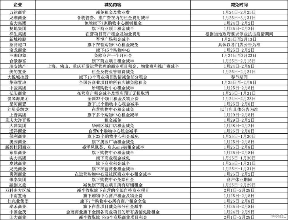 1月28日,万达商管集团对全国各地所有万达广场的商户,从1月24日至2月25日内的租金及物业费全免,将减免租金30亿~40亿元。随后,龙湖集团加入,龙湖商业对旗下商场的所有商户,由今年1月25日(农历年初一)至3月31日期间,租金费用(含物管费、推广费)减半,时长达到67天,预计减免金额超5亿元。
