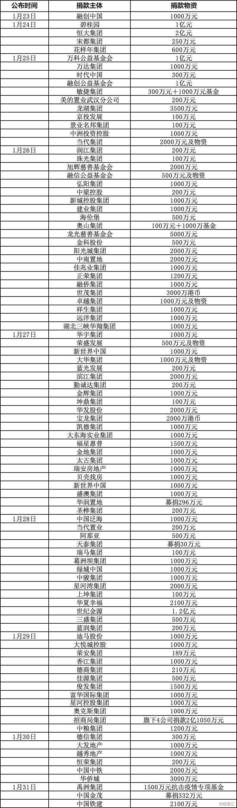 据不完全统计显示,自1月23日至1月31日以来,约350家公司向武汉及湖北疫区捐款,总额达121.29亿元,其中房企捐款总额占约12%。目前,已有超110家房企、物业公司通过捐资捐物、减免商铺租金等方式加入到驰援队伍中来,捐款总额已达15亿元。其中,TOP10房企中,恒大集团捐款2亿元、融创中国捐款1.1亿元,万科和碧桂园各1亿元。