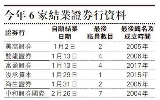在假期前,包括美高证券、双龙证券及富盈证券亦通知自1月2日、1月13日及1月16日宣告自愿停业。当中今月初结业的美高证券,曾经由元亨燃气(0332)前身毅力工业持有及发起,持股一半,后来由毅力主席林文灿购回股权。换言之自2020年以来,自愿结业的证券行累计达6家,受影响从业员共20人。