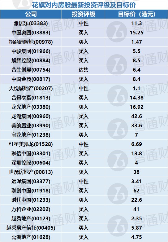 花旗发布报告称,更新对内房股最新投资评级及目标价,如下表: