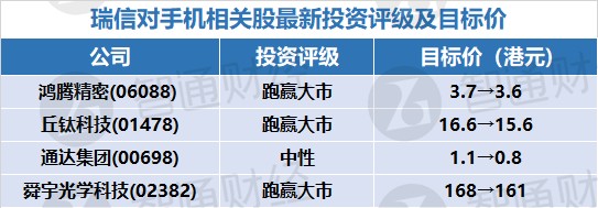 该行表示,对手机相关股最新投资评级及目标价如下表: