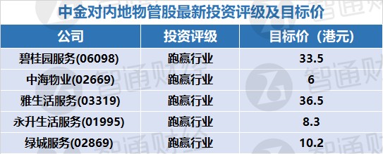 发布报告称,更新对内地物管股最新投资评级及目标价,如下表:
