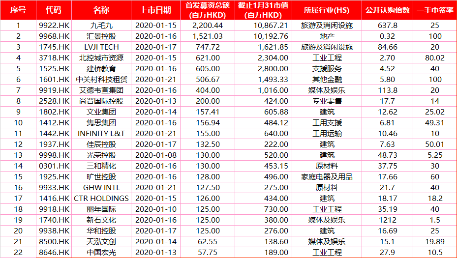 从市值上看,在一月份22家上市的公司中,只有九毛九和汇景控股在截止1月31日的市值超过100亿港元,其余20家公司市值都在30亿港元以下,占总量比重达90%。