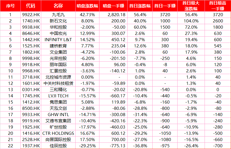 首先看看华盛暗盘数据统计,在22只新股中有9只暗盘收市一手赚96港元以上,占比达40.9%。