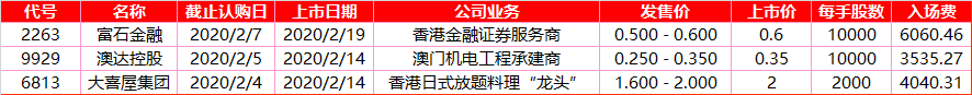 目前暂定2月份上市已经开启招股的公司有三家,分别是2018年香港日式放题料理市占率第一的大喜屋、澳门机电工程承建商澳达控股以及香港金融证券服务商富石金融。