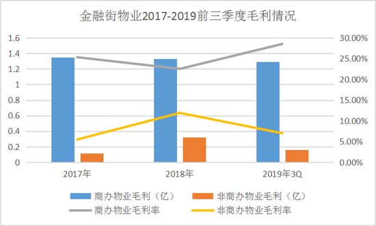 2017年至2019年三季度,金融街物业的毛利分别1.46亿、1.62亿及1.41亿元,录得毛利率分别为19.2%、18.5%及20.5%。其中,商务物业毛利分别为1.35亿、1.33亿、1.29亿。