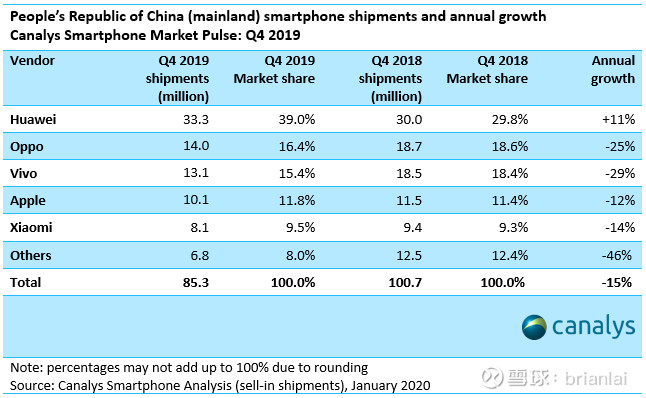 - 2019 Q4,小米中国区手机销量 810 万部(Canalys 数据)网页链接,2018 年 Q4 的数据是 940 万部。2019 年 Q4 没啥新机,主要在清库存,算是稳住了。这个季度,小米下滑的不算夸张,OV 两家在国内市场下滑那叫非常严重了,分别是 25% 和 29%。