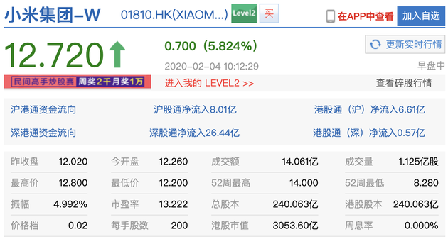 新浪科技讯 2月4日上午消息,小米股价盘中涨幅近6%,截至10:12小米涨5.824%报12.720港元,市值3053.60亿港元。