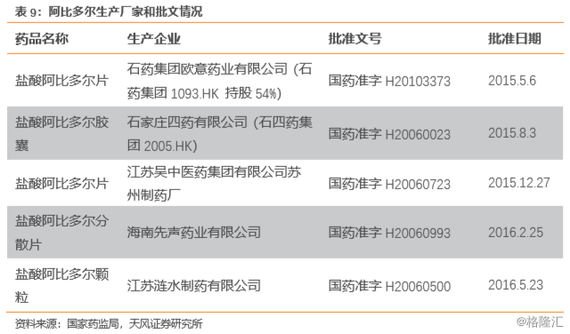 阿比多尔为预防和治疗流感药物,通过抑制流感病毒脂膜与宿主细胞的融合而阻断病毒的复制,对冠状病毒可能也具有一定效果。其通过抑制病毒表面的血凝素,阻止病毒在宿主细胞表面吸附内吞、融合,阻止病毒进入,从而阻断病毒复制,将病毒拦截在细胞外。在治疗流感的同时还能够诱导干扰素的生成、提高机体免疫力,对呼吸道合胞病毒、副流感、鼻病毒、冠状病毒等其他急性呼吸道病毒感染均有抑制作用,也可用于慢阻肺、病毒性肺炎等。在病原学不是十分明确的情况下,阿比多尔可能有更多获益。石药集团指出,阿比多尔片作为一种广谱抗病毒药物,对SARS-CoV的半数抑制浓度IC50为 7.14µg/mL,对MERS-CoV的治疗指数是2.19,且为SARS和MERS冠状病毒治疗和预防专利药物。
