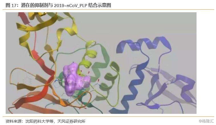 候选药物包括蛋白酶抑制剂茚地那韦、沙奎那韦、洛匹那韦、卡非佐米、利托那韦等12种抗HIV药物,2种抗呼吸道合胞病毒药物,1种抗人巨噬病毒药物,1种抗精神分裂症药物,1种免疫抑制剂以及2种其他类药物;研究发现含有“二苯乙烯”结构的孟鲁司特以及植物药活性成分虎杖苷和脱氧土大黄苷与2019-nCoV水解酶(Mpro)结合较好,可能对病毒有抑制作用;在前期抗SARS研究及计算机模拟基础上发现老药肉桂硫胺、环孢菌素A可能对2019-nCoV有效,其中肉桂硫胺是上世纪70年代用于抗精神分裂症的药物,对冠状病毒3CL水解酶具有抑制作用,免疫抑制剂环孢菌素A可以阻止病毒的核衣壳蛋白与人的环孢亲和素A相互结合,已有研究表明联用干扰素和环孢菌素A能显著抑制冠状病毒在人类支气管和肺部复制及造成的组织损伤。研究还发现,虎杖、山豆根等中药材中可能含有抗2019-nCoV有效成分。