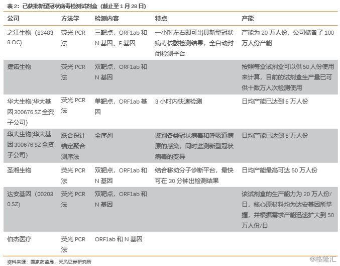 超过50家体外诊断企业已研发出新型冠状病毒检测试剂盒,1月26日,国家药品监督管理局应急审批通过4家企业4个新型冠状病毒检测产品,分别是上海之江生物科技股份有限公司、上海捷诺生物科技有限公司、华大生物科技(武汉)有限公司、武汉华大智造科技有限公司。1月28日,在批准两家企业产品上市,分别为圣湘生物和达安基因。1月31日批准伯杰医疗的试剂盒上市。
