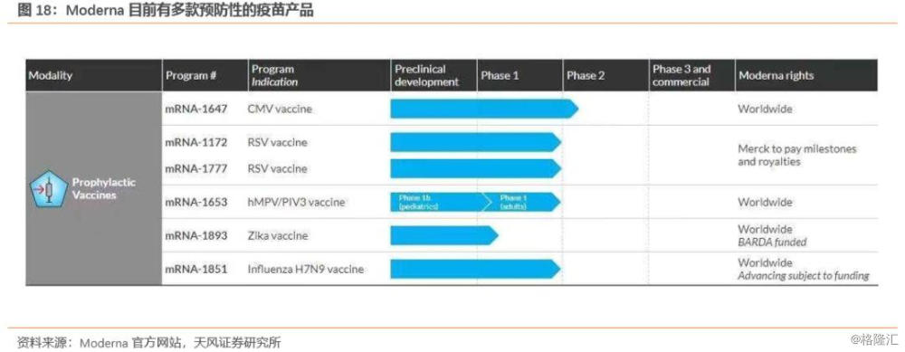 目前,Moderna公司的临床研发管线中有多款“预防性”的疫苗产品,其中进展最快的一款在研疗法为mRNA-1647,针对巨细胞病毒(CMV)感染。其已在一期临床中取得了积极结果,现已进入二期临床,进一步评估其安全性和免疫疗效。该平台“有可能”应对冠状病毒等新兴的病毒威胁,该公司亦期望其疫苗能带来潜在的免疫反应,缓解当下的公共卫生紧急事件。