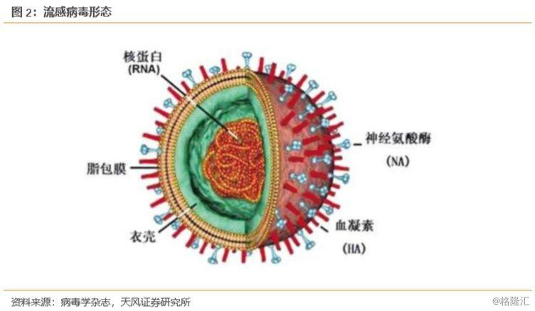 流感病毒由蛋白外壳、基质蛋白和内部的核酸物质组成,外壳上有两种重要蛋白,血凝素(HA)和神经氨酸酶(NA),具有抗原性,同时神经氨酸还具有酶活性。病毒种类也可根据HA和NA的抗原性不同分为H1-15,N1-10,不同HA和NA的组合构成病毒多个种类。