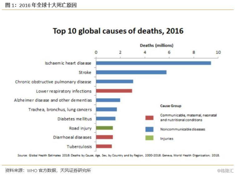 根据WHO2016年数据,2016年全球死亡5690万人,其中54%的都是由于TOP10死因。全球10大死亡原因中,由于传染性呼吸道感染疾病导致死亡人数约为300万人,排在TOP10的第三位。在收入较高国家,呼吸系统导致的死亡率明显降低,多是由于较好的卫生环境和医疗资源。