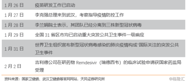 观点:目前尚无用专门于预防和治疗2019-nCoV的药物,面对紧急公共卫生事件,从头开发新药以及疫苗研发可能需要较长时间周期,远水解不了近渴,我们认为当下老药新用可能更加具有现实可行性。近期已有多家科研机构发现一批可能对新型冠状病毒有效的老药,然而其对新型冠状病毒的有效性仍然需要进一步的临床研究予以佐证,我们在对此抱有期望的同时也应保持客观。