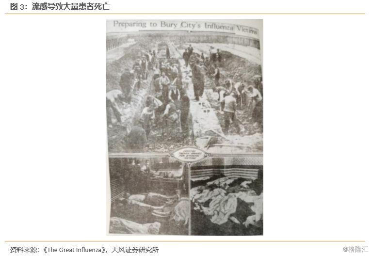 对病毒的误判也是其重要原因之一。比如美国费城,在1918年9月28日政府忽视科学家的建议,依然大规模举办自由公债游行,大量的人员聚焦成为了爆点。72小时候,费城出现了大量患病人员,并且已经有了致死性。1918大流感发病进程非常快,通常2-4天就有明显症状,甚至更短时间。流感造成每天几百例新发到每天成千上万人新发,从一两个死亡病例到几百人死亡,只用了短短10天。有记载,费城遍地尸殍,尸堆成山。由于病人死前由于肺部感染,多有紫绀现象,很多人呈现全身发黑,民间谣传黑死病再度来袭,而比疾病更可怕的,则是人们心里的恐惧。