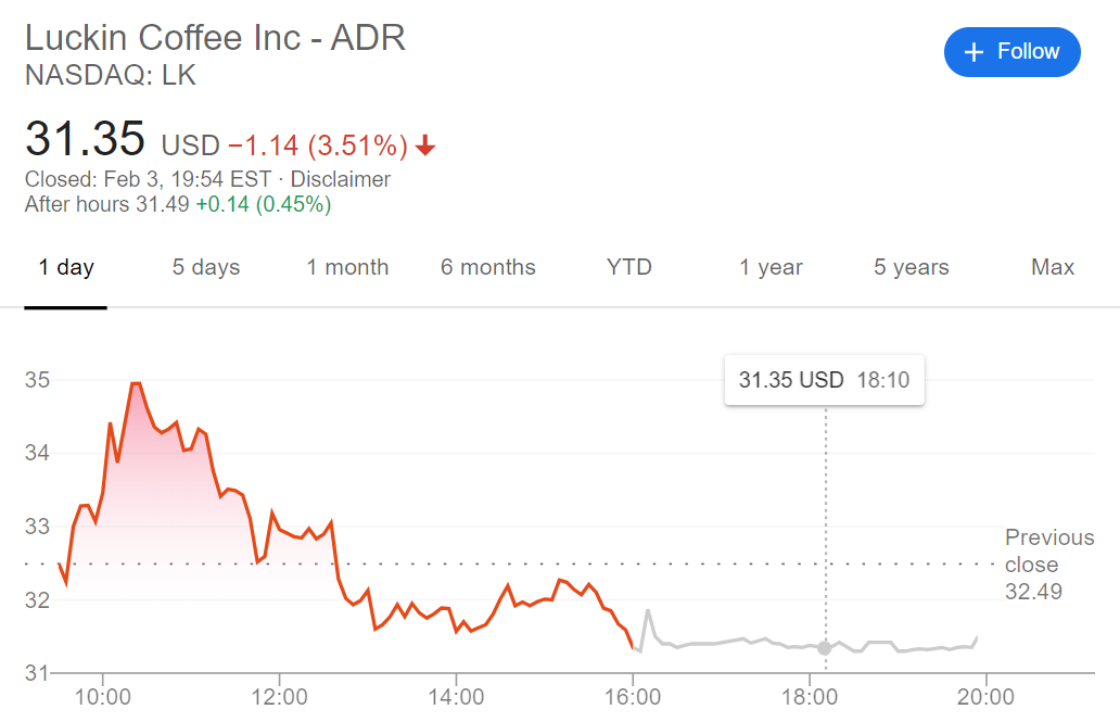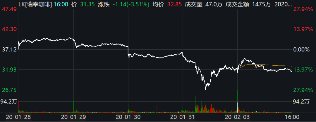 受到回应的刺激,23日美股盘前一度下跌超8%的瑞幸咖啡由跌转涨,盘中最高涨超3%,但最终报收31.35美元,跌幅3.51%。截至北京时间2月4日14时,瑞幸咖啡在盘后股价小涨0.45%。