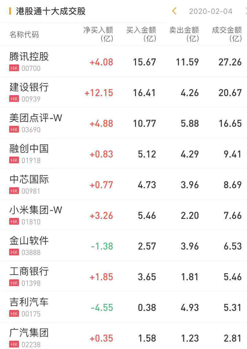 港股通资金今日净流入港股41.77亿港元。今日净买入腾讯控股4.08亿港元,净买入小米集团3.26亿港元,净买入建设银行12.15亿港元。