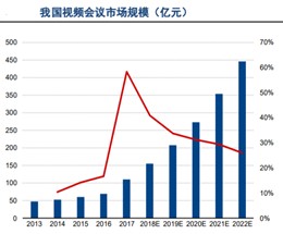数据显示,2012-2019年全球视频会议市场的市场规模已经从319亿美元增长至550亿美元,而从2017年到2021年,专业机构预计全球视频会议的CAGR将达到8.3%。文章开篇提及的异动股Zoom,正是目前领先的移动视频会议工具,公司在2013年时仅拥有客户4500家,而2017年的客户数已快速成长至70万家,足见视频会议市场的庞大需求。反观国内市场,视频会议行业主要由政府机关,医疗、教育、金融等领域的公共事业机构及企业带动需求,整个市场规模逐年增长,近年来增长率保持在20%以上,据专业机构测算,2018年国内视频会议市场规模约155.6亿元,预计至2022年规模将达到445.7亿元。