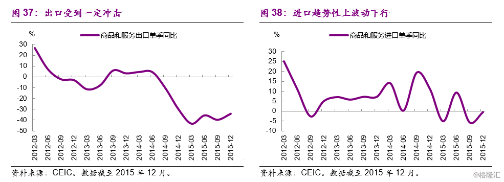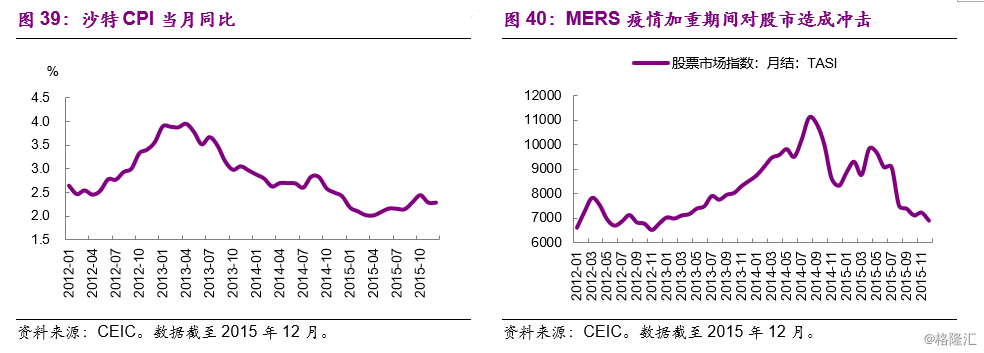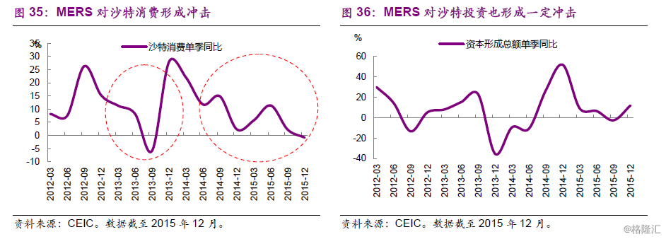 MERS对消费影响较大,对投资也造成一定影响。从消费来看,在MERS爆发的初期和集中爆发的两个时期,沙特的消费均呈现下滑态势。从投资来看,在疫情集中爆发期,2014年二季度与2015年二、三投资呈现稳中趋弱的态势,受到疫情的一定影响。而在两次集中爆发期之间,出现了一个投资峰值,更体现出疫情对企业投资生产情绪产生的影响。