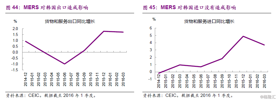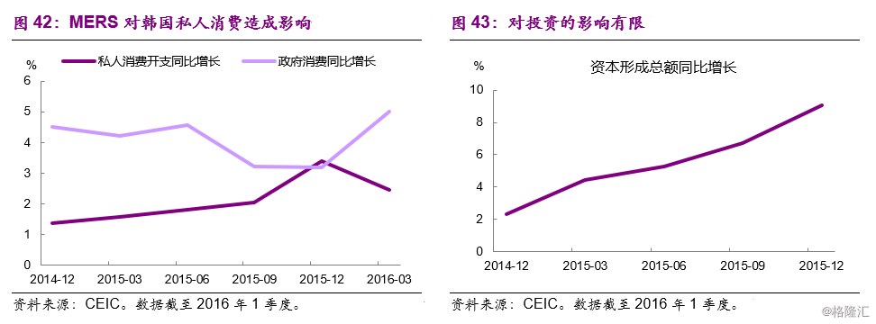 从消费来看,私人消费受到影响,MERS发生时,可以看到居民消费在第二季度的上涨较为明显。在5月20日韩国出现首例MERS传染者之后十天里,韩国电子购物网站Auction拍卖网上,口罩销量增长了709%,洗手液增长了147%;食品销量也同比大幅增加,金枪鱼罐头销量增加了60%,猪肉增加了97%,牛肉增加了79%,快餐、盒饭的销量分别增加了100%和50%,但在6月份后明显出现下滑,但政府购买增加,主要是医疗设施购买增加所致。从投资来看,影响也有限。