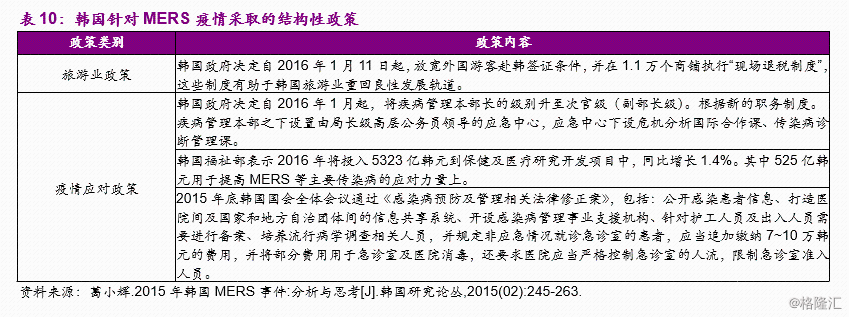 MERS疫情在韩国结束后,韩国采取了一些了政策,包括放宽入境旅游方面的政策,同时提升疾病管理本部长的级别,并设定分管机构,提升统一管理和应对疫情的能力,同时加大对传染病的投入,并出台相关法案。