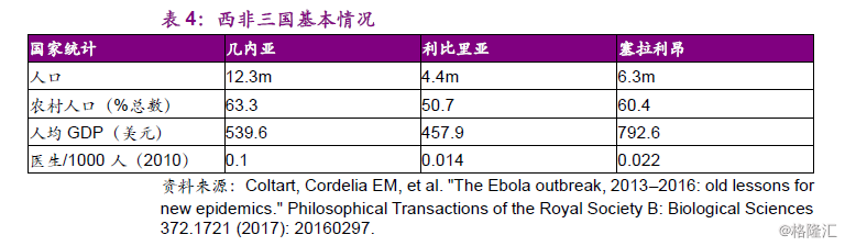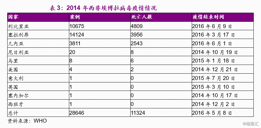 2014年2月,西非地区开始爆发大规模的埃博拉病毒疫情,主要集中爆发于几内亚、利比里亚、塞拉利昂三国。2016年1月14日,世界卫生组织宣布非洲西部埃博拉疫情结束。最终感染人数为28646人,包括11324例死亡,死亡率为40%(表3)。