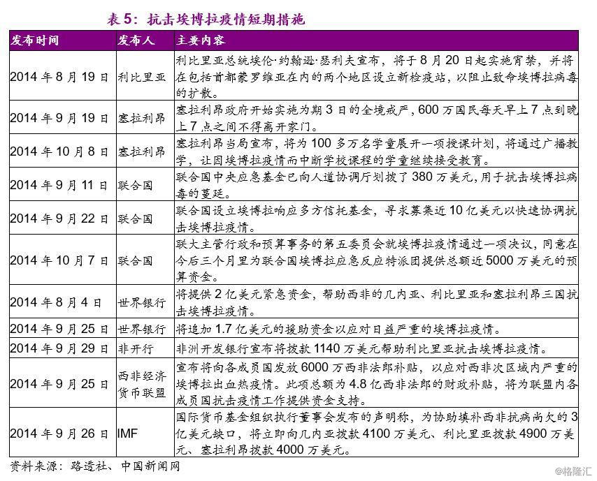 埃博拉病毒传播的速度之快,病毒致死率之高迫使相关疫情国政府不得不快速出台相关短期应对政策。与此同时,非洲地区大规模疫情的爆发也引起了国际社会的高度关注,其他国家或地区以及联合国、世界银行、IMF等世界组织也相继推出了一系列防疫、财政支援政策来协助西非三国抵抗疫情(表5)。