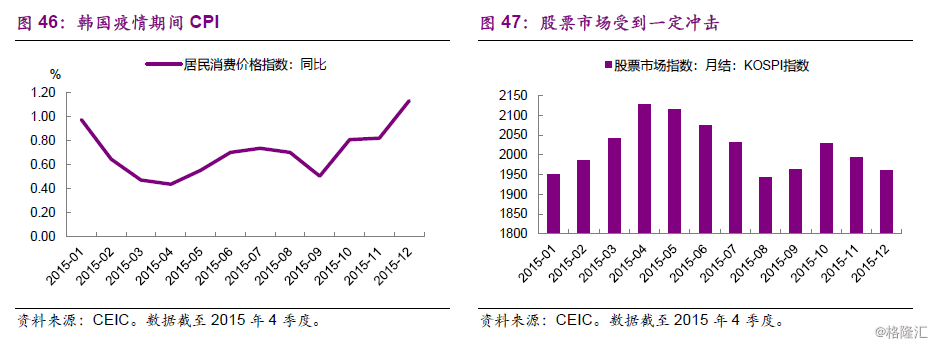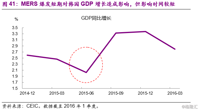 从GDP的增长来看,在2015年5月疫情出现后,对二季度GDP整体造成一定冲击,但随着7月份之后疫情得到控制,经济增长随即增长向好。根据韩国现代经济研究院的统计数据,MERS疫情导致2015年韩国GDP比预期值低0.2%~0.3%。