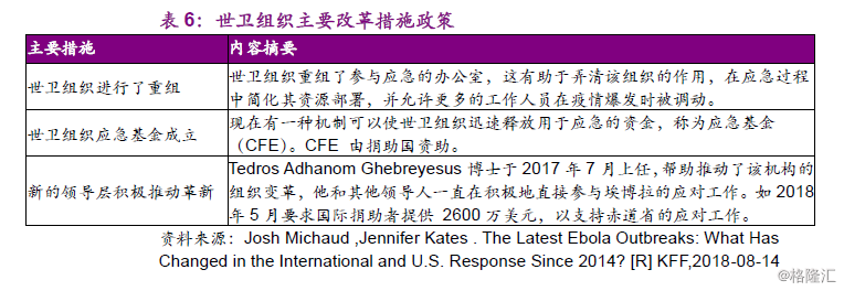 自埃博拉病毒在2014大规模爆发之后,世卫组织早期对埃博拉疫情处理进展的低效和缓慢也受到了一些批评[21] 。造成这种初期响应不佳的因素有很多,其中包括:疫情响应的预算在两年内减少了50%以上,相应的具有相关经验的工作人员也流失了;短期内没有足够的资金来支持意外的重大应对行动的费用;世卫组织内部的决策流程复杂,使快速的协调和决策变得困难。为此联合国成立了特派团,取代世卫组织进行对抗疫情的协调工作。由此世卫组织针对以上问题进行了几个方面的改革(表6)。