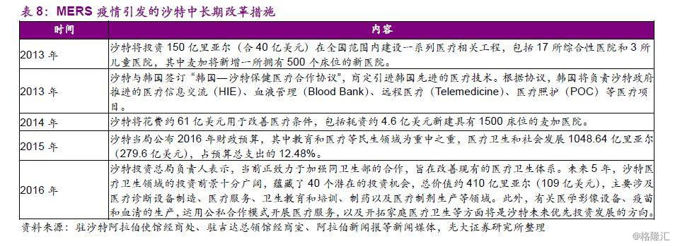 从沙特对MERS的中长期应对和改革措施来看,主要集中在医疗系统的建设(表8)。