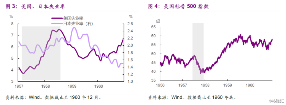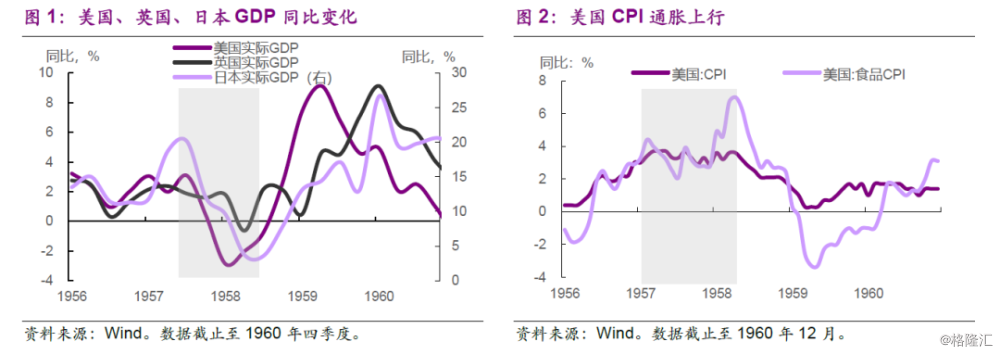 “亚洲流感”恰逢1958-59年的全球大衰退,对全球经济的负面影响无疑是雪上加霜。战后脆弱的需求与工业生产的快速扩展的矛盾,以及货币和财政政策刺激与紧缩的扰动,形成了战后每隔若干年来一次的衰退。而美国为抑制前期经济过热采取的货币紧缩,以及债务上限争论后的财政紧缩是58-59年经济衰退的直接导火索,美国实际GDP同比从57年三季度的3.1%下滑到了58年一季度的-2.9%,失业率从57年8月的4.1%上升到58年7月的7.5%,但美国通胀一直在上升,食品通胀尤为明显。美国的衰退也蔓延到欧洲和日本等地,英国和日本的经济增长率也开始下行,失业率上升,成为全球范围的衰退。相对经济表现,美国的股市自1957年7月到1957年12月持续下行,但是在1958年初就回到了上升的轨迹。