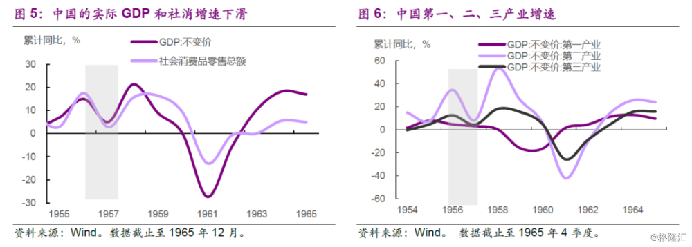 “亚洲流感”对中国亦有负面影响,但较短暂。1957年中国的实际GDP同比从1956年的15%下降到5.1%,其中第二产业下滑最多(从34.5%下滑到4.4%),社消从17.5%下滑到2.9%,但是与1959年到1961年中国出现严重的三年自然灾害相比,经济波动较小。