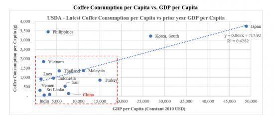 先不谈这个图的回归曲线R平方拟合系数只有0.4282,图片本身除了呈现一下中国咖啡消费“低迷”没有任何其他意义,单说其分析中据此就断定瑞幸的咖啡前景不乐观,显得太武断。