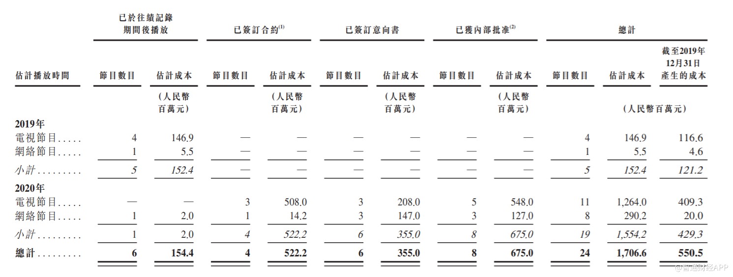 煜盛文化在招股书中也提到,公司从数目有限的节目获取绝大部分收入,如这些节目有任何延迟播出、取消或提早终止参与,均可能会对公司的业务、财务状况及经营业绩造成重大不利影响。