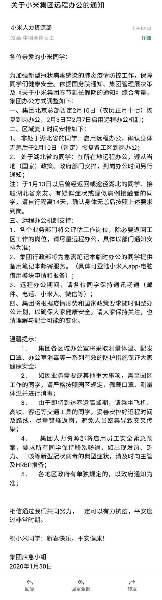 1月30日,小米发布了远程办公的通知,除湖北省以外的员工于2月3日起远程办公,2月10日起,确定身体无恙的员工到岗办公,而湖北省的员工则是持续远程办公,等待相关部门安排,小米也为需要笔记本电脑远程办公的员工提供了邮寄服务。