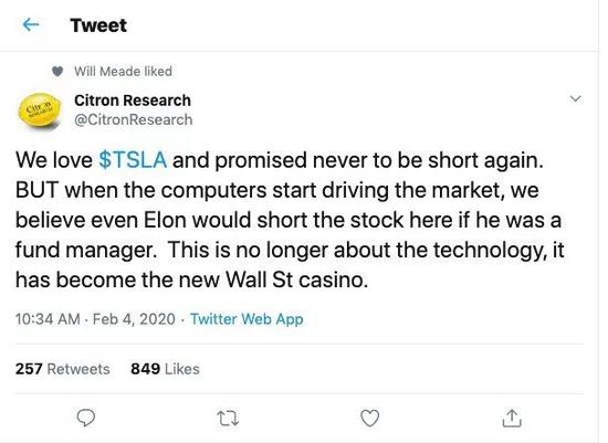 鉴于特斯拉目前‘疯涨’的股价,此前宣布不再做空特斯拉的香椽研究公司(Citron Research)也坐不住了,决定出山,重操旧业。
