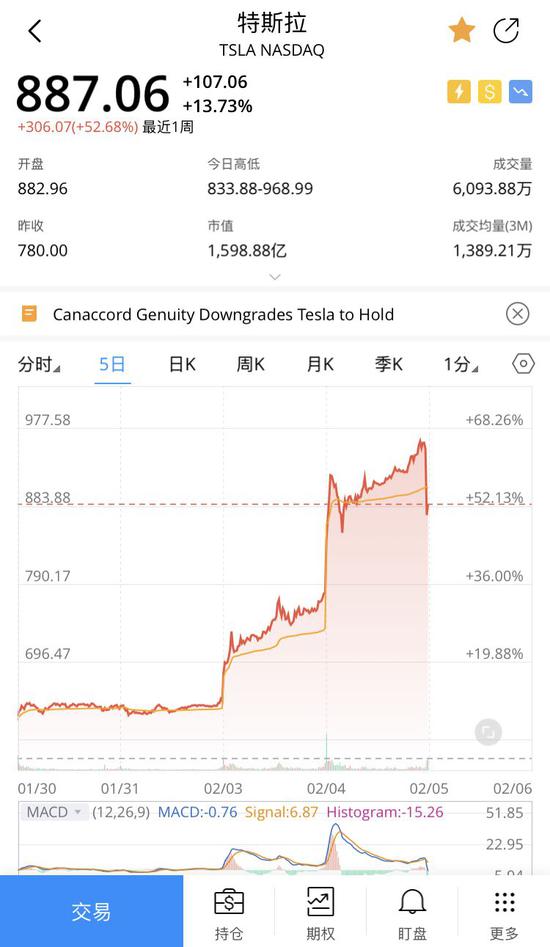 原因其实很简单——股价。美东时间 2 月 4 日,特斯拉收盘于 887.06 美元,对,你没有看错,这就是特斯拉现在的股价。在盘中,它甚至一度攀升到 968.99 美元,逼近 1000 美元大关。