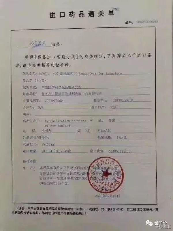 与此同时,网络上也开始流传一张有关瑞德西韦“进口药品通关单”,其中显示这批药物从北京入关的,总共2843盒,每盒一支注射剂,其中有150毫克药物。